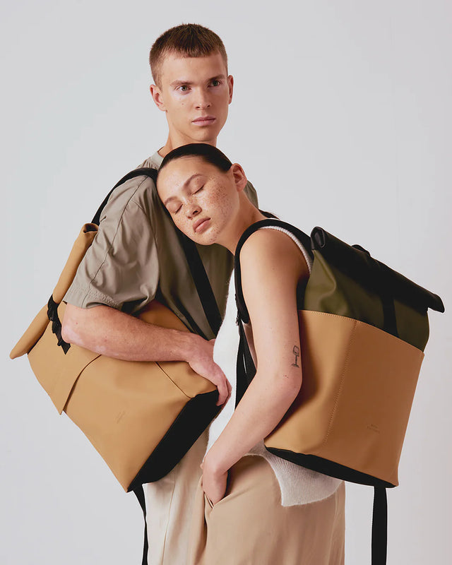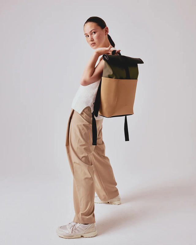 This minimalist backpack is the smaller version of Hajo Medium Backpack (about a quarter smaller). Whether on the road by bike, shopping or in the nightlife, it’s suitable for any occasion. The roll-top closes with a hook and loop fastener and allows a practical filling of the Hajo Mini Backpack which features a zipped compartment on the outside.